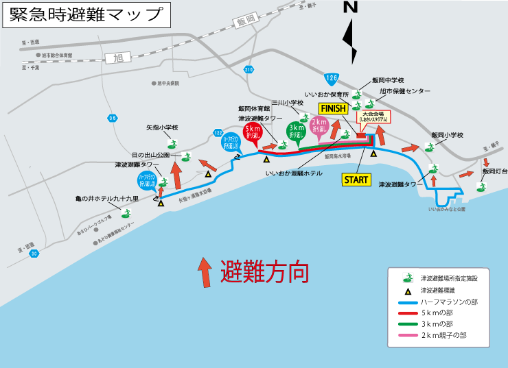 - 震度5弱以上の地震もしくは津波警報が発令された場合は、ただちに大会役員の指示に従い、緊急時避難マップに記載の避難所へ避難してください。レースは中止します。